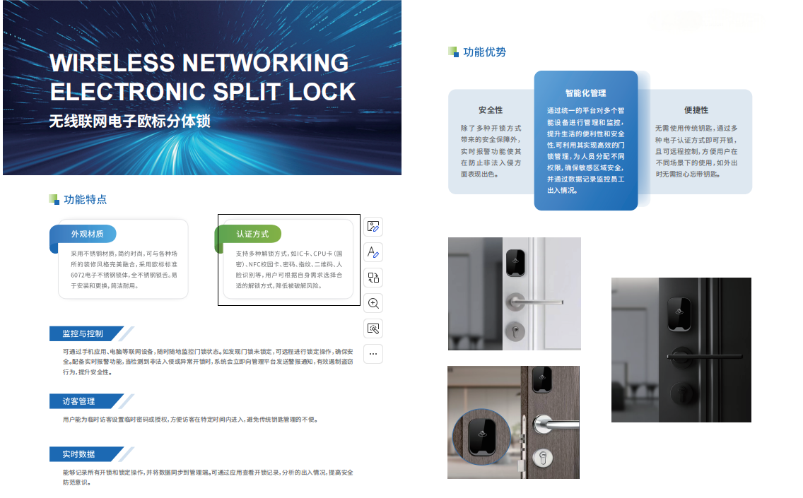 产品面板采用不锈钢板,6068#电子防盗锁体;采用全304不锈钢锁舌,并对锁体进行特殊加固设计,满足30万次开启寿命,满足校园、公租房、企业园区等场景高强度、高频次使用,减少了维护成本。